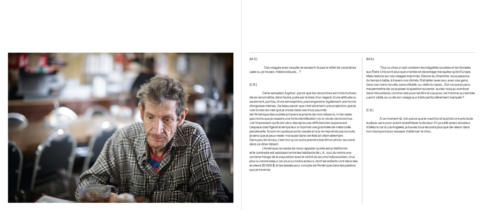 À rebours des approches habituelles et des bavardages technico-artistiques, la photographe décide d’entreprendre une conversation, à bâtons rompus, avec un sociologue de fortune, rencontré au débotté, sans le moindre tabou. Dans cette plongée au cœur de l’intime et du plus singulier, le lecteur est invité à voyager dans une Amérique profonde comme impavide aux affres du temps pour se retrouver dans un universel resté jusque-là silencieux … En filigrane, abondent des «clichés» lesquels revêtent une sensation d’un «déjà vu».